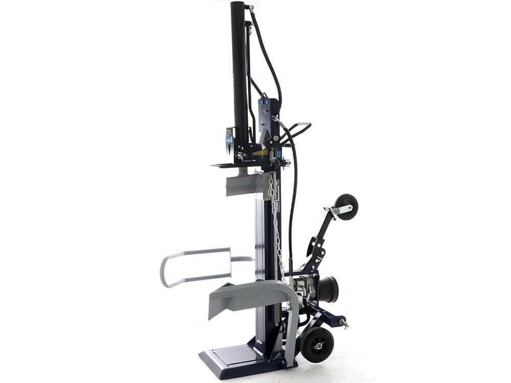 A máquina conta ainda com rodas integradas, sistema de elevação de toras com bloqueio, plataforma de apoio sólida e comandos de segurança conformes às normas CE.