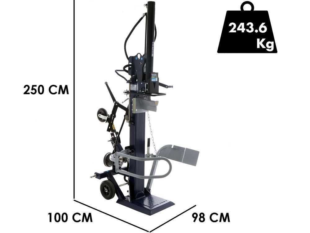 Com força de fendagem de 16 toneladas, é capaz de dividir toras com diâmetro de 8 a 30 cm e até 110 cm de comprimento. A ligação ao trator é feita através de um cardan (velocidade máxima <560 RPM) e um engate de três pontos que garante estabilidade e segurança durante o trabalho.