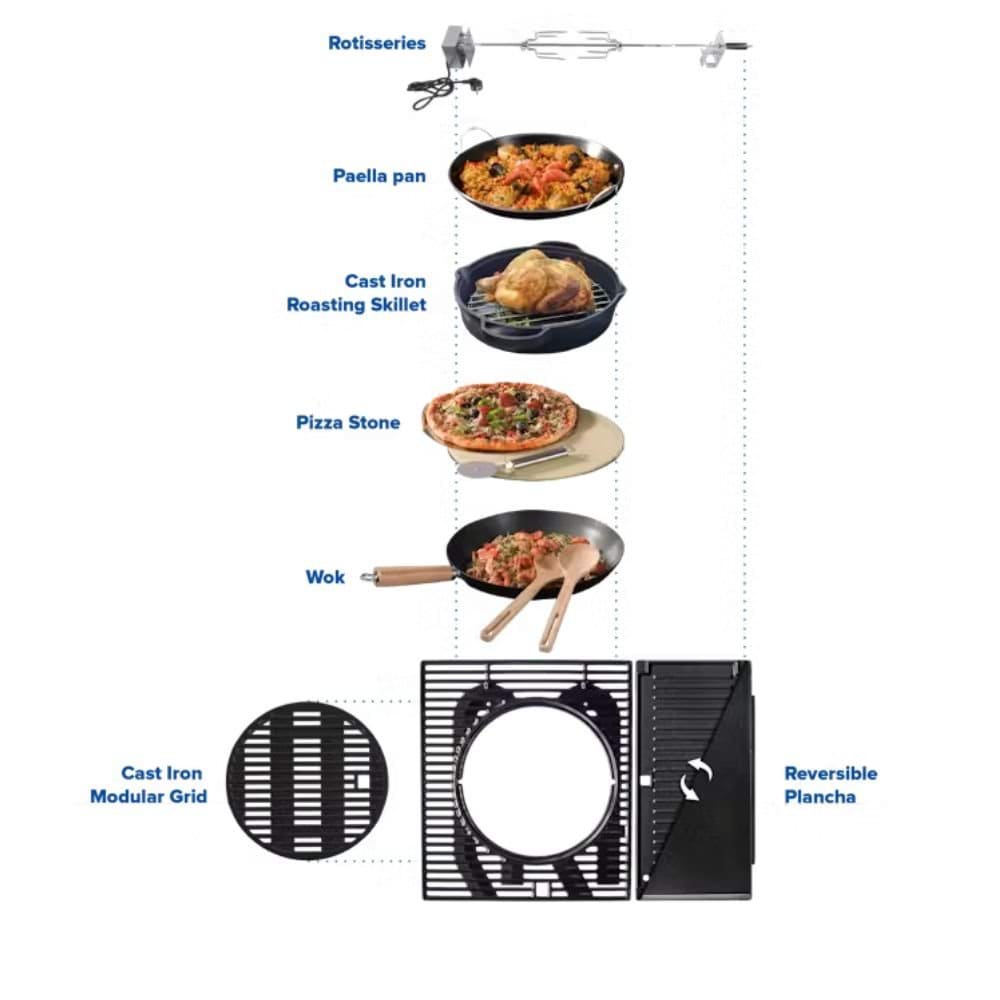 Seus três queimadores Blue Flame de aço inoxidável (9,6 kW) garantem calor uniforme e menos chamas, deixando os alimentos suculentos, enquanto o queimador lateral de 2,3 kW prepara acompanhamentos. Com uma grelha de ferro fundido esmaltado de 2.800 cm² (61 x 46 cm), o sistema Módulo Culinário e a grelha de aquecimento (62 x 17 cm), oferece versatilidade para cozinhar ao ar livre. A limpeza é simples com o InstaClean Aqua Pro, e o design premium inclui ignição InstaStart com controles iluminados, mesa Push2Fold, tampa com termômetro e carrinho fechado com rodas para até 13 kg de gás.