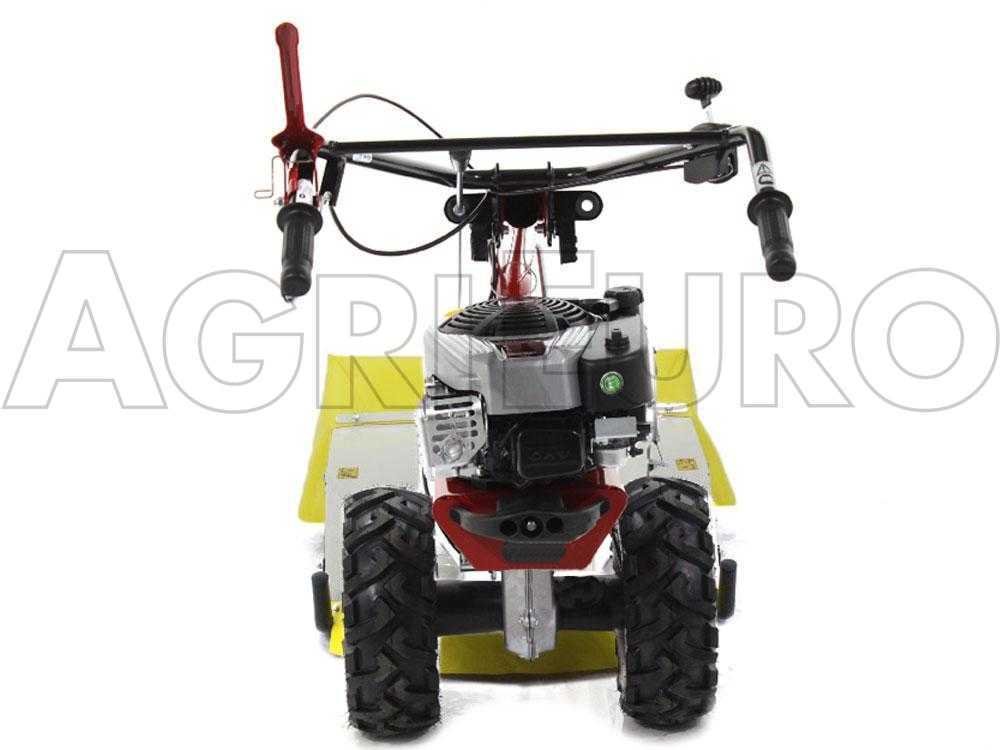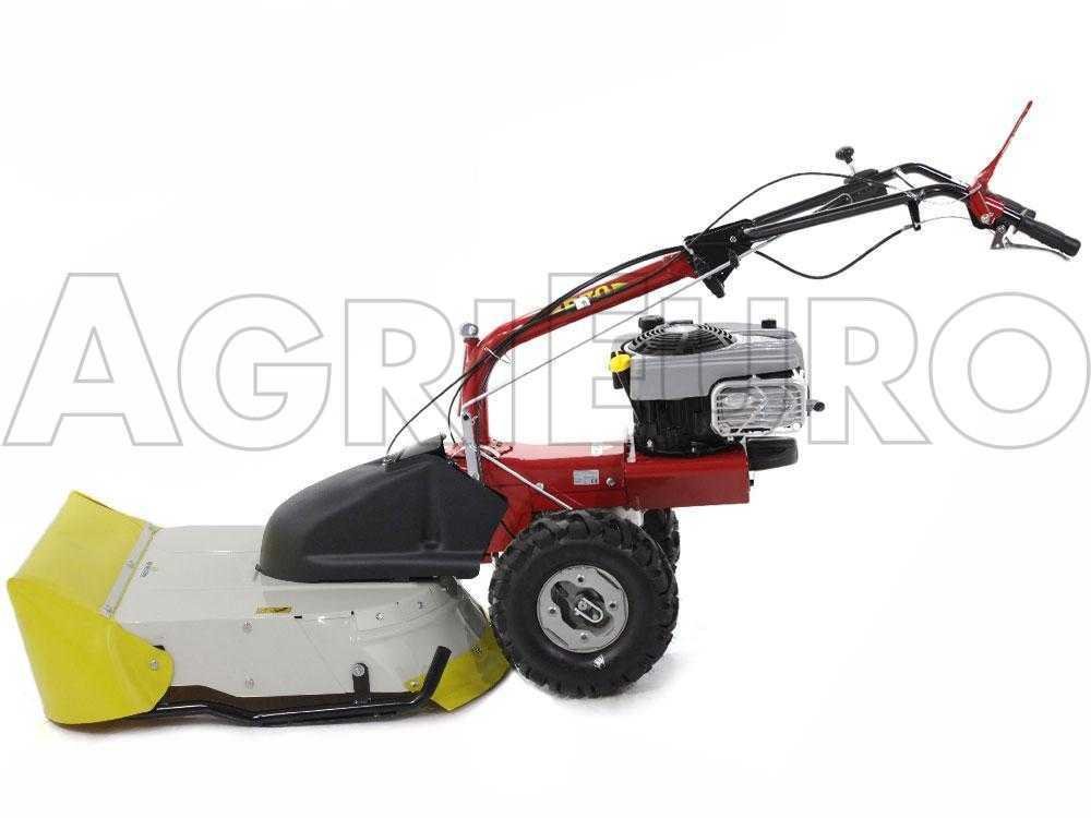 Il s’agit d’une tondeuse débroussailleuse innovante autotractée, équipée de grandes roues profilées tractées, reliées à une transmission à engrenages à bain d’huile et disposée avec une boîte à 5 vitesses (3 avant + 2 arrière).