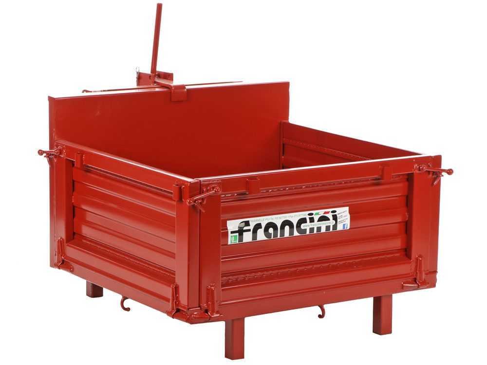 Francini P100 – Caixa basculante para trator 100 cm, 400 kg. Aço reforçado, 3 laterais removíveis, fabrico italiano. Compacta, robusta e fácil de usar.