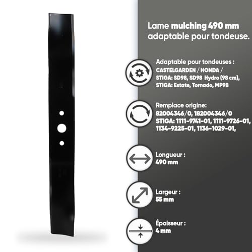 - LAME DE REMPLACEMENT POUR TONDEUSE MULCHING : Cette lame de tondeuse d’une longueur de 490 mm est idéale pour remplacer la lame d’origine et optimiser les performances de votre tondeuse mulching Castelgarden, Stiga ou Honda.