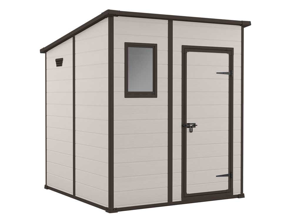 Keter Manor Pent 183,5x185x200 cm. Abrigo de jardim compacto com janela frontal, resistente, elegante e sem manutenção. Ideal para espaços pequenos.